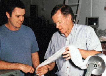 Gary Robinson (right) and Phil Henry from CSIRO Geelong examine a top made from wool from the Fine Wool Project